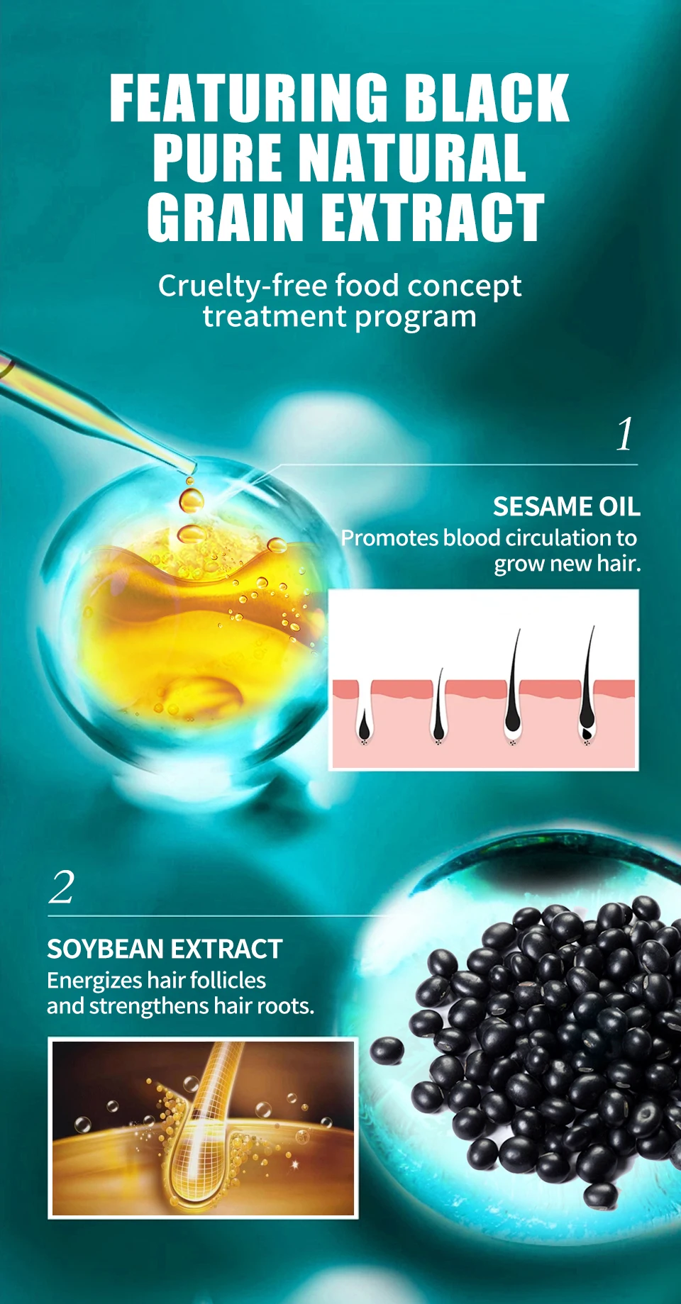Soybean extract: Extracted from black grain essential oil, providing energy to hair follicles and strengthening hair roots.