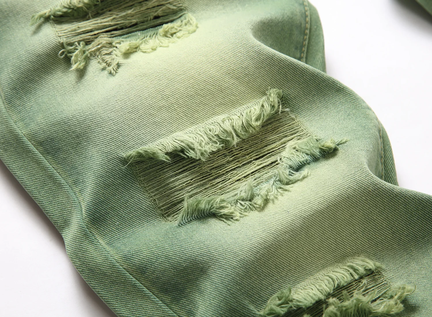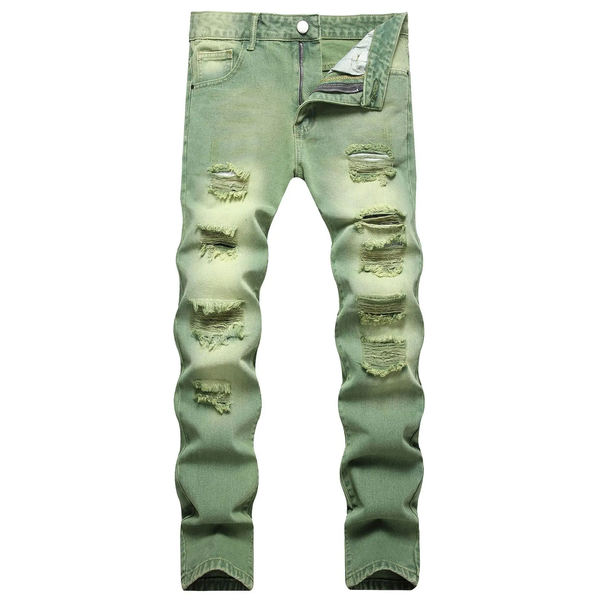 Men's Green Straight Pants Vintage Ripped Hole Jeans