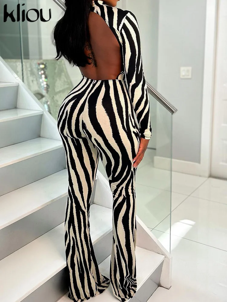Women Classic Fashion Long Sleeve Striped Print Jumpsuits